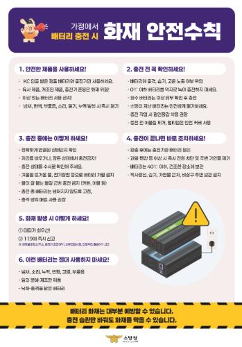 또한 배터리는 40℃ 이하의 건조한 장소에 보관하고, 충전 시에는 멀티탭의 안전 커버를 사용하는 등 주변 환경 관리도 중요하다고 당부했다.